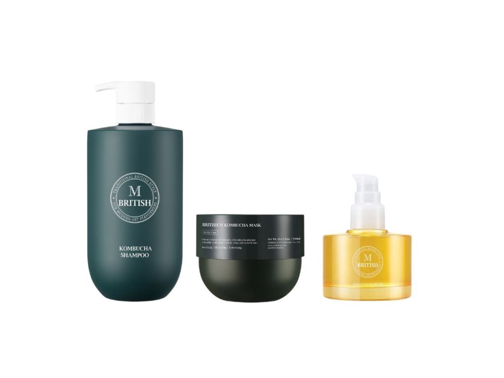 BRITISH M - KOMPLETNÍ VLASOVÝ RITUÁL - Kombucha šampon, kombucha kondicionér a anato oil 3 produkty