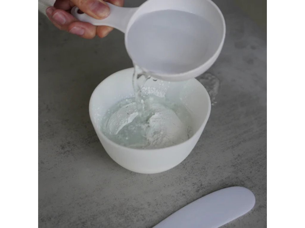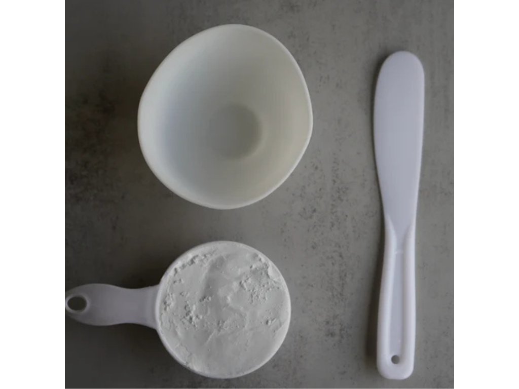 Po vyčištění obličeje připravte misku, odměrku a špachtli - odměrka a silikonový štětec jsou součástí balení.