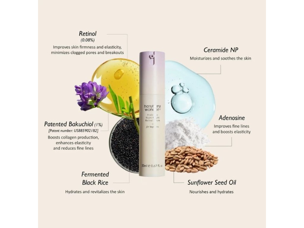 HARU HARU WONDER - BLACK RICE NIGHT KNIGHT RETINOL SERUM - Noční regenerační retinolové sérum s bakuchiolem a fermentovanou černou rýží 20 ml