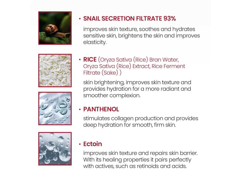 Lehký, ale vysoce výživný pleťový krém s 93 % šnečího mucinu, který intenzivně regeneruje, hydratuje a pomáhá obnovovat poškozenou kožní bariéru. Kombinace šnečího sekretu, rýžových extraktů a fermentů zlepšuje texturu pleti, rozjasňuje a sjednocuje tón. Ideální pro každodenní péči o pleť, která působí unaveně, mdle nebo vykazuje známky stárnutí.