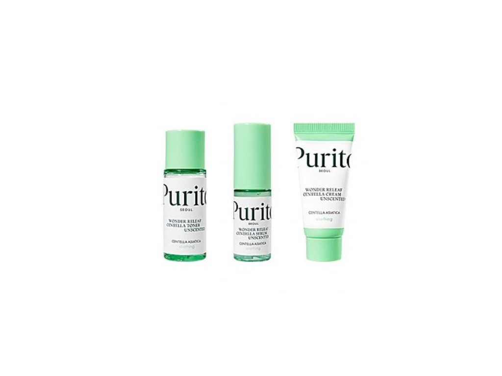 PURITO SEOUL – WONDER RELEAF CENTELLA MINI KIT UNSCENDED – Zklidňující mini sada s Centella Asiatica pro citlivou pleť bez parfemace