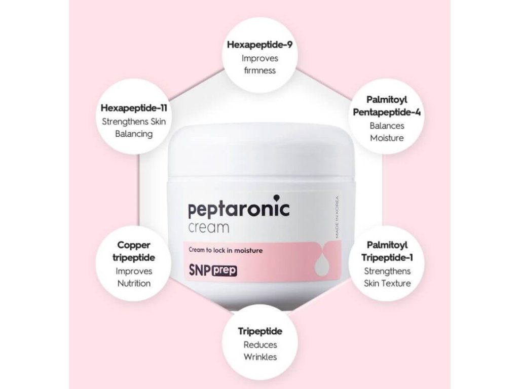 SNP Prep Peptaronic Cream je výživný krém, který obsahuje 6 druhů peptidů, které pomáhají omlazovat pleť, zvyšovat její elasticitu a rozjasňovat ji. SNP Prep Peptaronic Cream je součástí Peptaronic řady od SNP, ve které najdete "zlatou" kombinaci peptidů a kyseliny hyaluronové. Tato kombinace poskytuje pokožce vitalitu a hlubokou hydrataci.